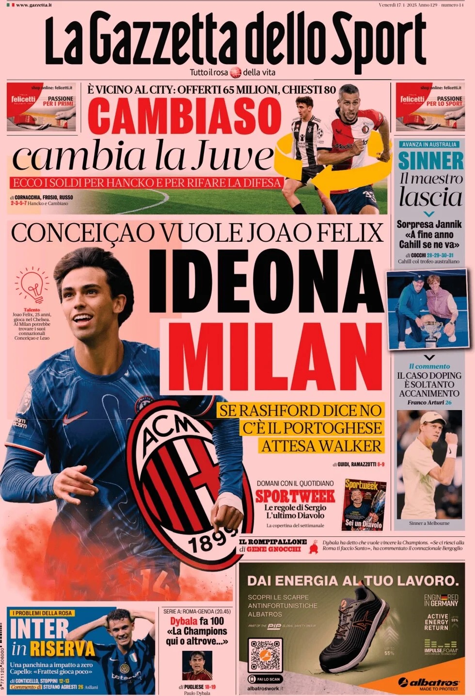 "Ideona Milan" è il titolo con cui si apre l'odierna edizione de La Gazzetta dello Sport in merito al mercato rossonero e al nuovo nome che si fa per l'attacco. Sergio Conceicao vuole Joao Felix. Se Rashford dice no, allora il portoghese sarebbe l'alternativa. Intanto c'è attesa per Walker.