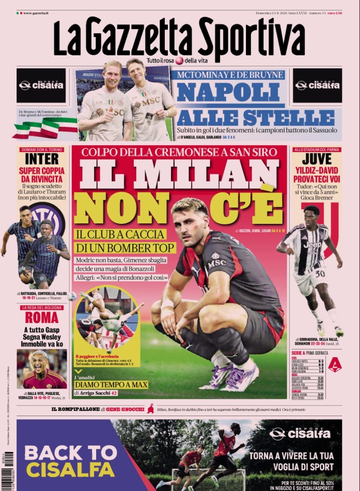 "Il Milan non c'è", titola la Gazzetta dello Sport raccontando del super colpo della Cremonese. La formazione di Davide Nicola ha superato il Milan 2-1 a San Siro nella prima giornata di campionato. A nulla è servito il momentaneo pari della squadra di Massimiliano Allegri firmato da Pavlovic.In taglio alto “Napoli alle stelle” con McTominay e De Bruyne: “Subito in gol i due fenomeni, i campioni battono il Sassuolo”.