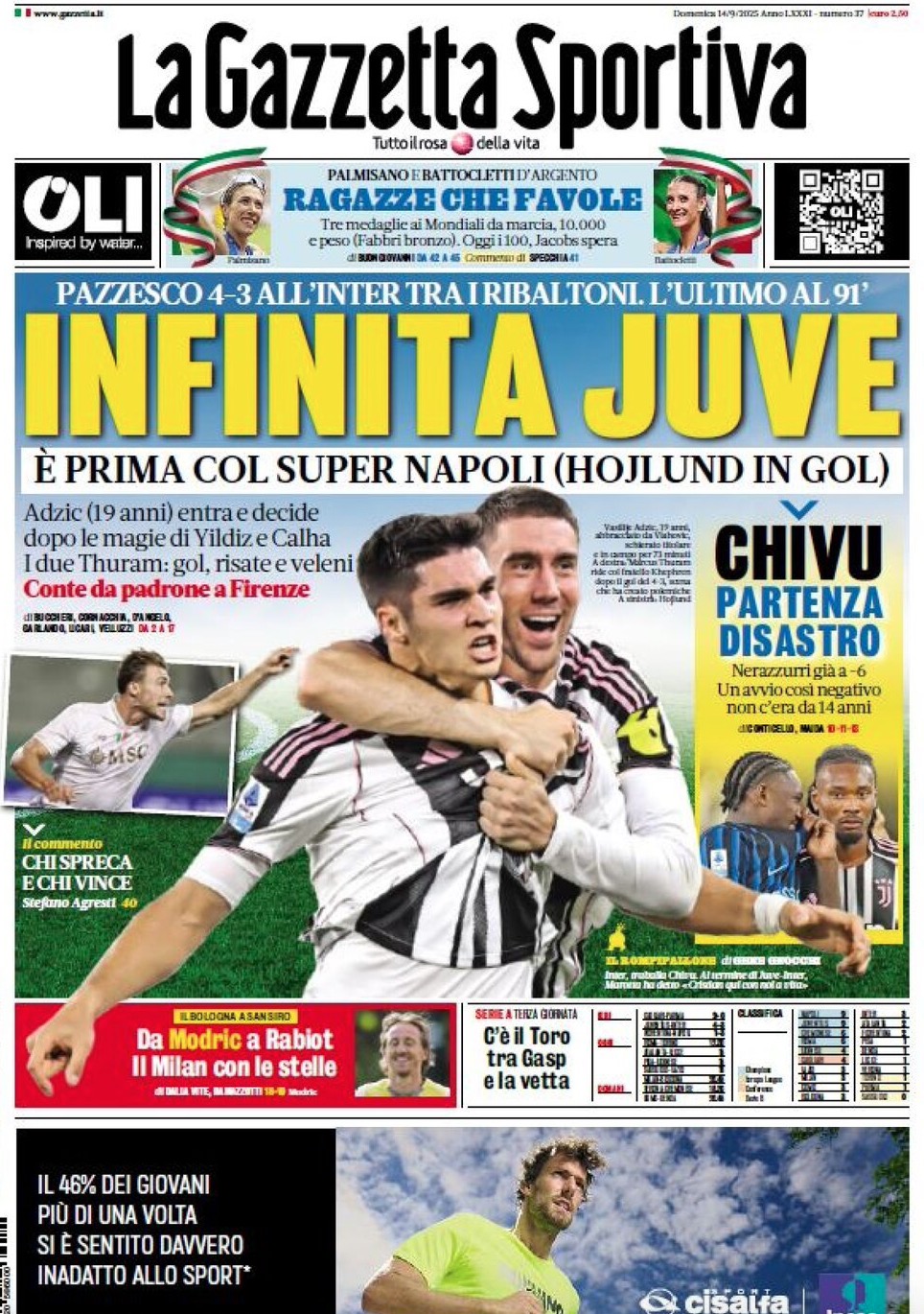 "Infinita Juve". Questo il titolo in prima pagina dell'edizione odierna della Gazzetta dello Sport. Successo in extremis per la squadra di Igor Tudor che si è imposta per 4-3 sull'Inter in un derby d'Italia davvero avvincente. Botta e risposta da una parte e dall'altra con la rete decisiva, davvero molto bella, realizzata nei minuti di recupero da parte di Adzic. “E’ prima col Super Napoli (Hojlund in gol)”, il passaggio con riferimento a Napoli. Di spalla invece spazio all’Inter: “Chivu, partenza disastro”.