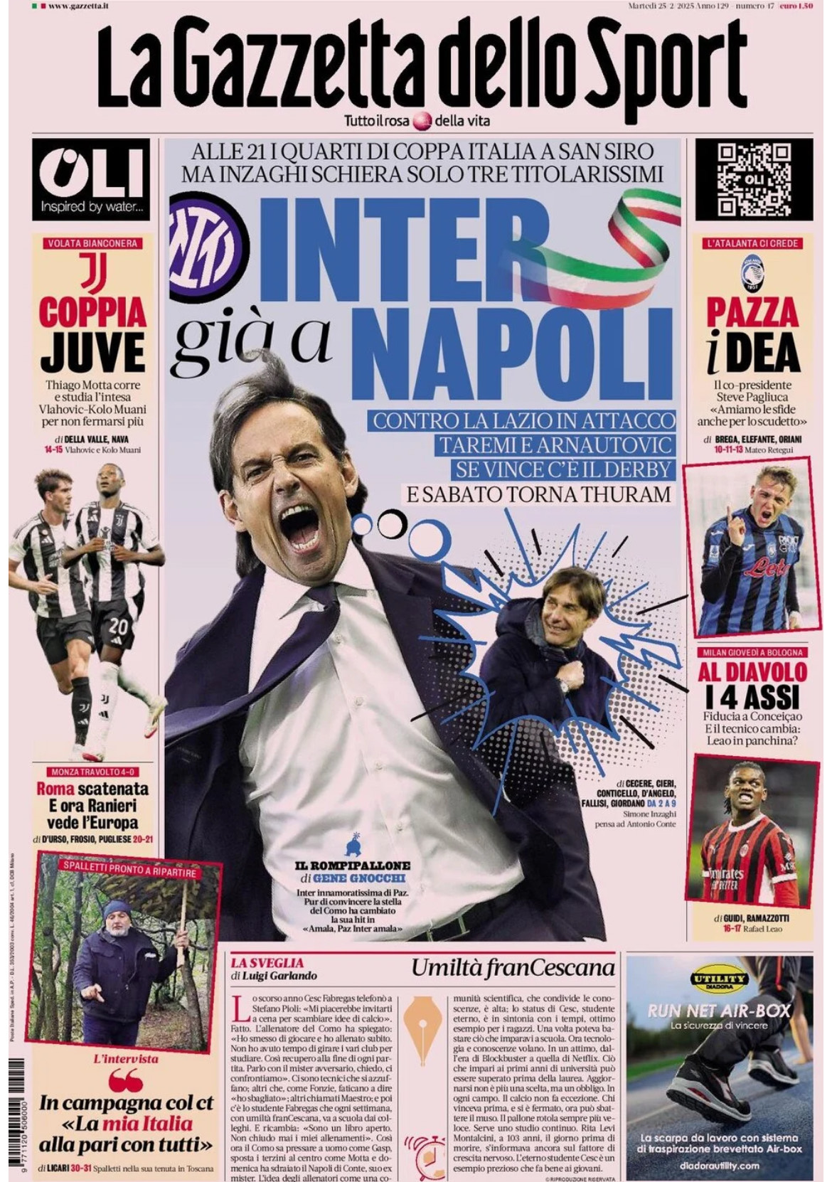 La Coppa Italia non sembra particolarmente urgente per l'Inter di Simone Inzaghi, impegnato questa sera alle 21:00 a San Siro contro la Lazio nel match da dentro o fuori dei quarti di finale. In palio un posto in semifinale contro il Milan, ma il tecnico dei nerazzurri - scrive in prima pagina La Gazzetta dello Sport - è con la mente già alla sfida del Maradona contro il Napoli di sabato pomeriggio ed è per questo motivo che dovrebbe schierare pochi titolari. In attacco non ci saranno né Thuram, alle prese con il problema alla caviglia che da settimane lo sta tormentando, né Lautaro, che contro la Lazio si riposerà. Pronta dunque la coppia inedita formata da Arnautovic e Taremi.
