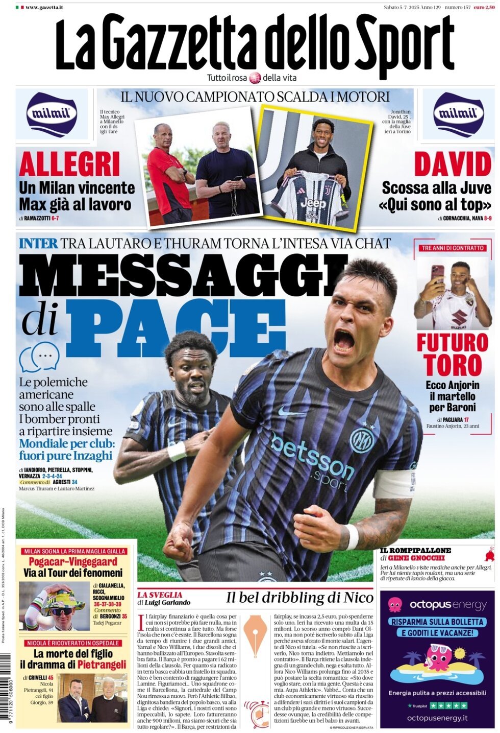 Nell'edizione odierna la Gazzetta dello Sport dedica l'apertura in prima pagina alla situazione in casa Inter, che dopo le polemiche durante il Mondiale per Club, sembra ritornare alla normalità: "Messaggi di pace. Tra Lautaro e Thuram torna l'intesa via chat". In taglio alto spazio al Milan con il nuovo corso Allegri: "Un Milan vincente, Max già a lavoro" e alla Juventus col nuovo acquisto David: "Scossa alla Juve: 'Qui sono al top'".
