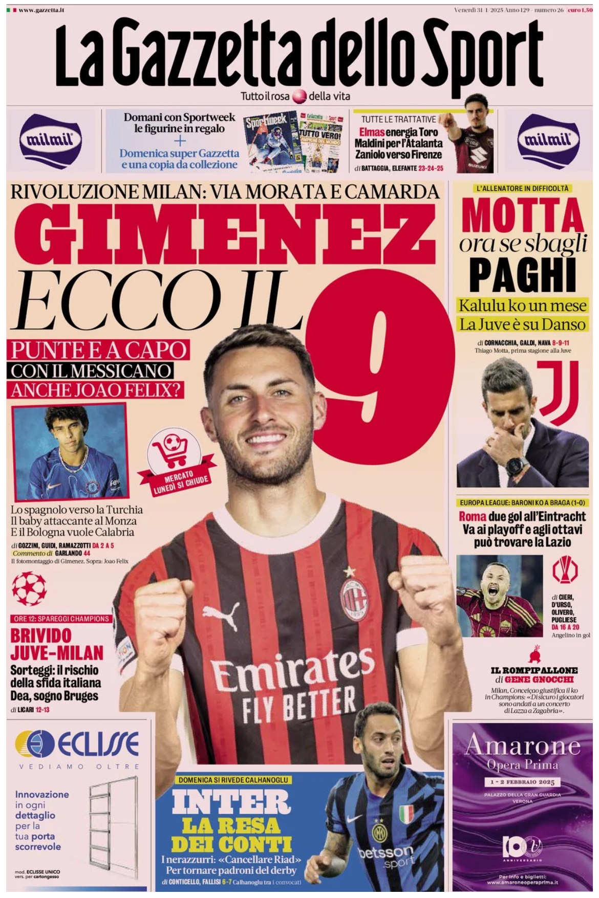 L'edizione odierna de La Gazzetta dello Sport apre con il mercato del Milan, che potrebbe cambiare completamente look al proprio attacco negli ultimi giorni di mercato. La dirigenza rossonera, infatti, dopo aver mandato in prestito a Monza il giovane Camarda, sarebbe ormai in procinto di salutare dopo soli sei mesi Alvaro Morata. Per l'attaccante spagnolo si fa sempre più largo l'ipotesi di un approdo al Galatasaray, per sostituire l'infortunato Icardi. Con la cessione di Morata il Milan andrebbe a puntare con forza su Santiago Gimenez, centravanti messicano del Feyenoord.