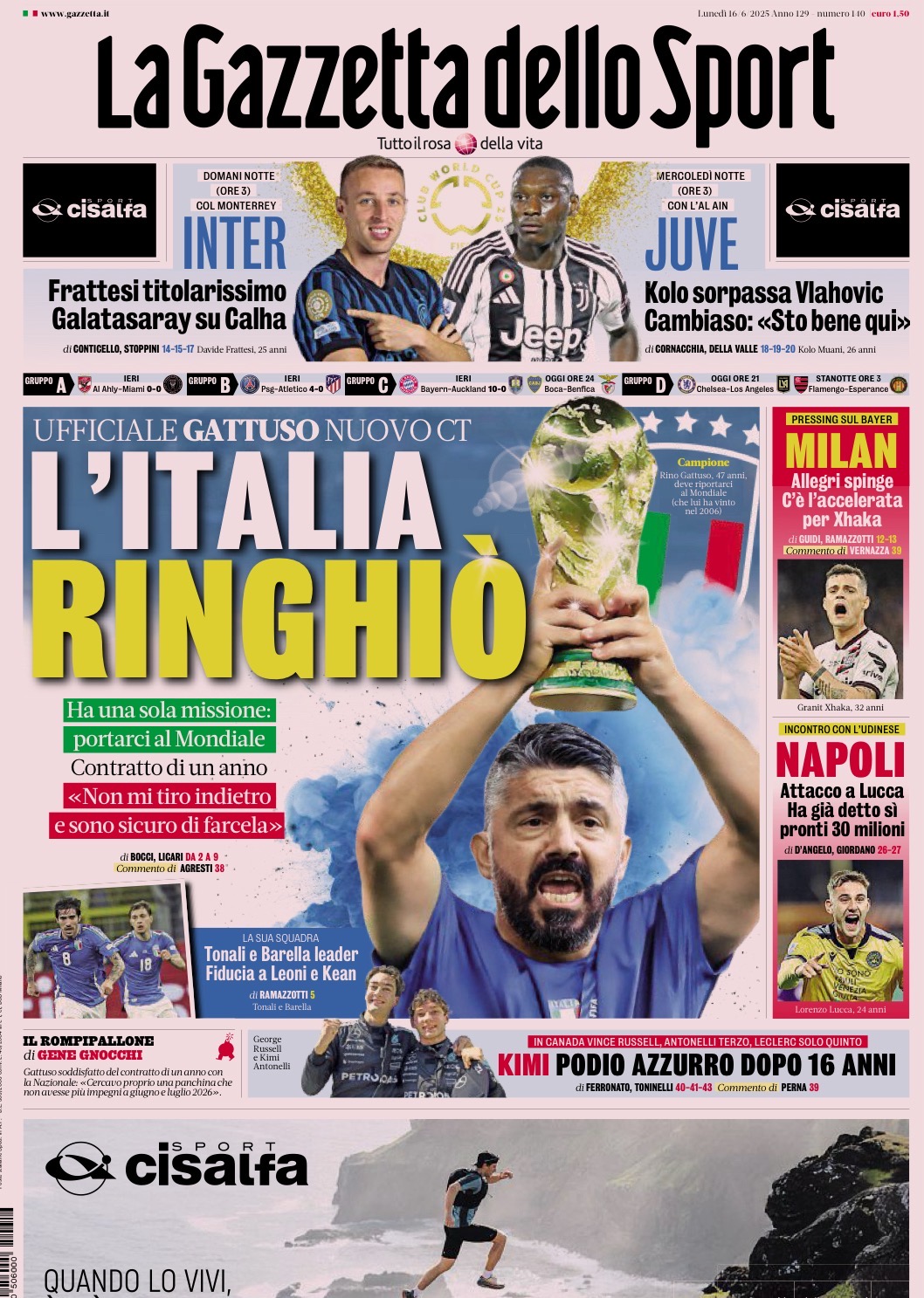 "L'Italia ringhiò", apre così in prima pagina La Gazzetta dello Sport nell'edizione odierna, dedicando l'ampio spazio centrale al nuovo commissario tecnico nella Nazionale italiana. Il sommario: "Ufficiale: Gattuso nuovo CT". In spalla, spazio al calciomercato del club di Aurelio De Laurentiis: "Napoli, incontro con l'Udinese. Attacco a Lucca. Ha già detto sì: pronti 30 milioni". Di seguito la prima pagina integrale.