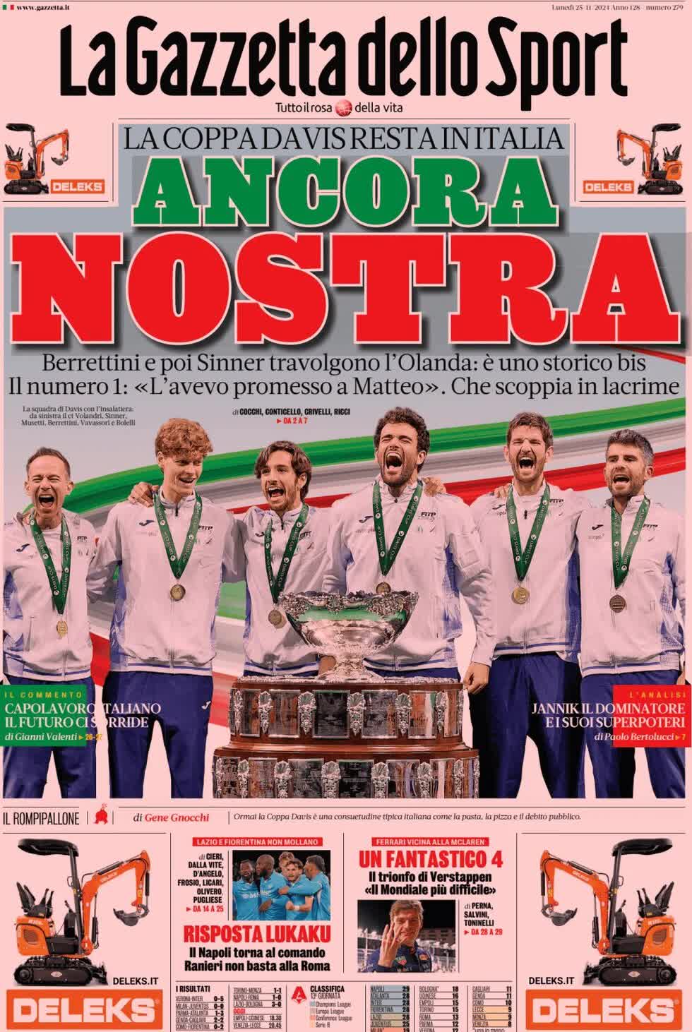 "Risposta Lukaku". Titola così in prima pagina La Gazzetta dello Sport, che ha celebrato la vittoria conquistata dal Napoli al Maradona contro la Roma. Gli azzurri sono rimasti in testa alla classifica, passando proprio con un gol dell'ex romanista di fronte al proprio pubblico. I partenopei quindi guidano la classifica a quota 29, seguiti da Inter, Atalanta, Lazio e Fiorentina a 28.