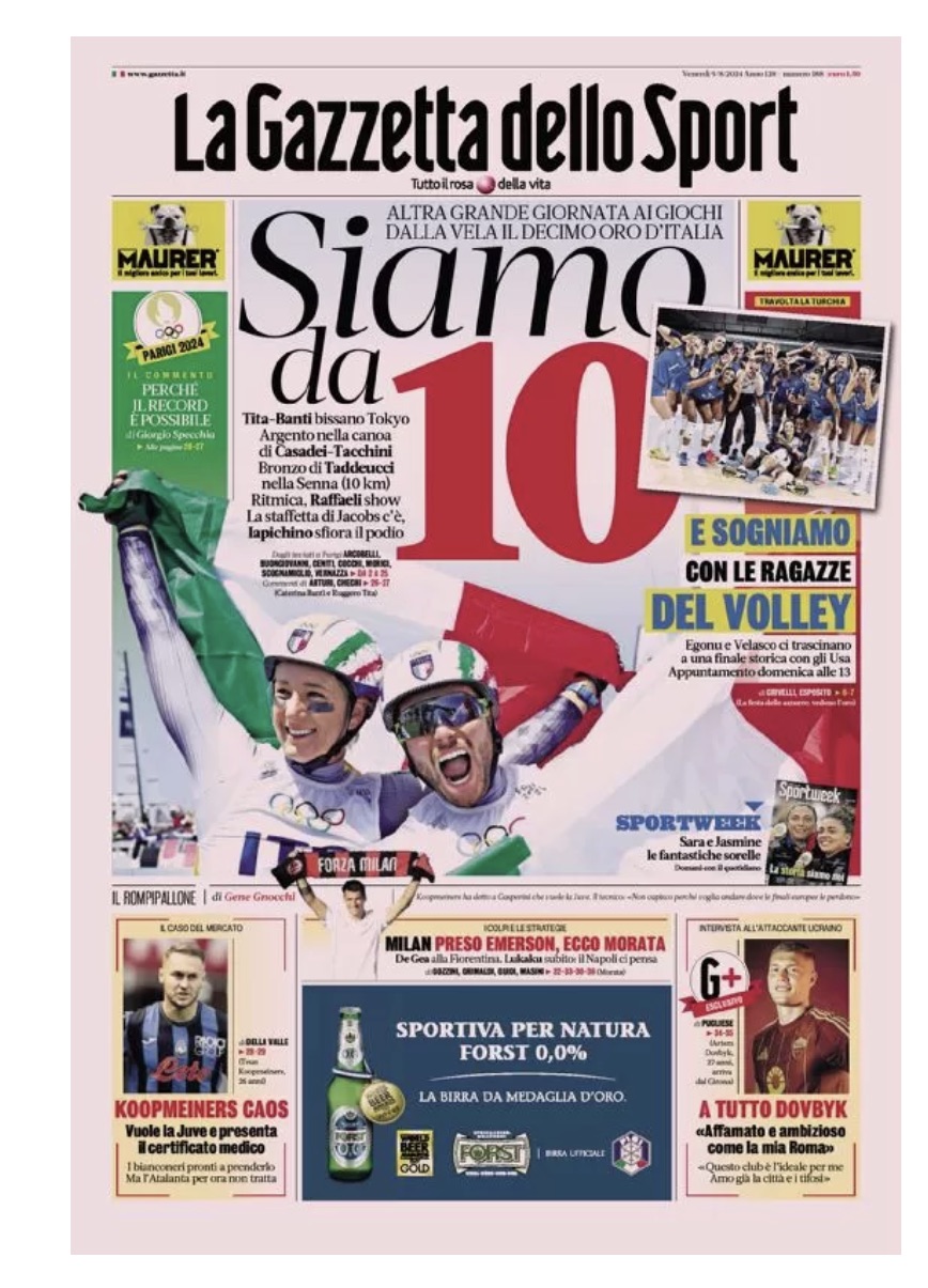 "Siamo da 10. Altra grande giornata ai giochi: dalla vela il decimo oro d'Italia", apre così in prima pagina l'edizione odierna de La Gazzetta dello Sport, in riferimento ai risultati dell'Italia alle Olimpiadi. In taglio basso spazio alla situazione del centrocampista olandese dell'Atalanta: "Koopmeiners Caos. Vuole la Juve e presenta il certificato medico". Un box è riservato alle prime parole del nuovo centravanti della Roma: "A tutto Dovbyk. Intervista all'attaccante ucraino: 'Affamato e ambizioso come la mia Roma'". Di seguito la prima pagina integrale.