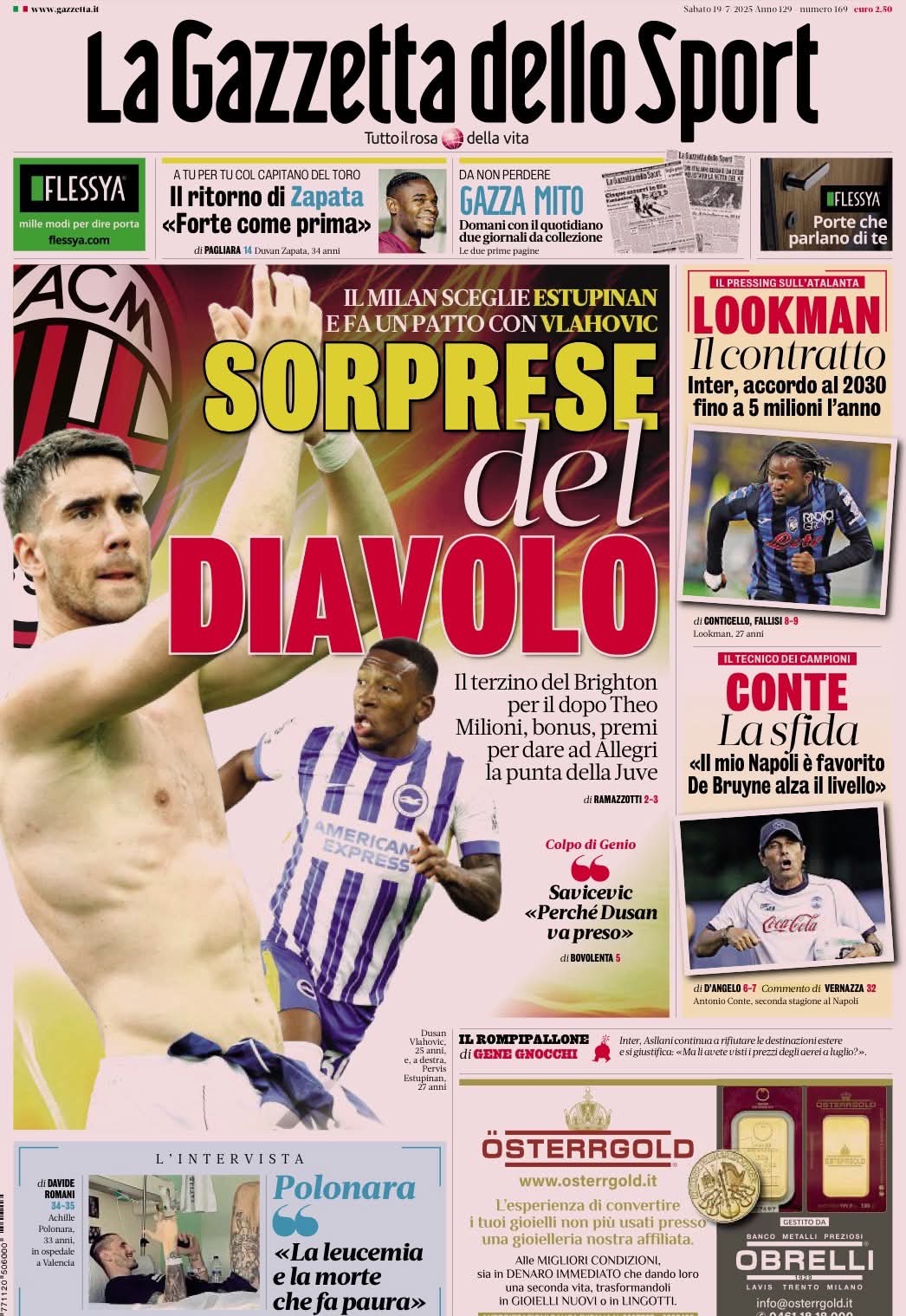 "Sorprese del Diavolo" scrive La Gazzetta dello Sport in apertura quest'oggi. Il Milan si muove sul mercato ed è pronto a consegnare nuovi rinforzi alla formazione di Max Allegri. Il terzino del Brighton Estupinian per il dopo Theo Hernandez dopo l'affare sfumato per Archie Brown. Attenzione anche alla pista che porta a Dusan Vlahovic dalla Juventus.