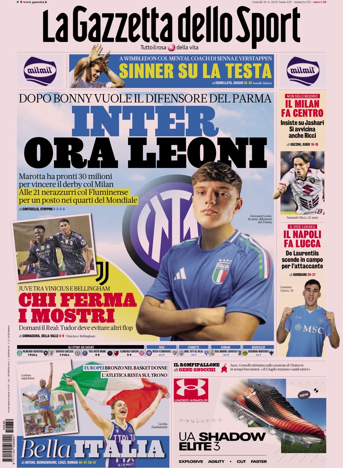 Non si ferma l’offensiva di mercato dell’Inter, che dopo aver messo le mani su Ange-Yoan Bonny guarda ancora in casa Parma per rinforzare la rosa. Nel mirino dei nerazzurri ora c’è Giovanni Leoni, difensore classe 2006 autore di un’ottima prima stagione in Serie A. A rilanciare la notizia è La Gazzetta dello Sport, che apre così la sua prima pagina: “Inter, ora Leoni – Dopo Bonny vuole il difensore del Parma. Marotta ha pronti 30 milioni per vincere il derby col Milan”.