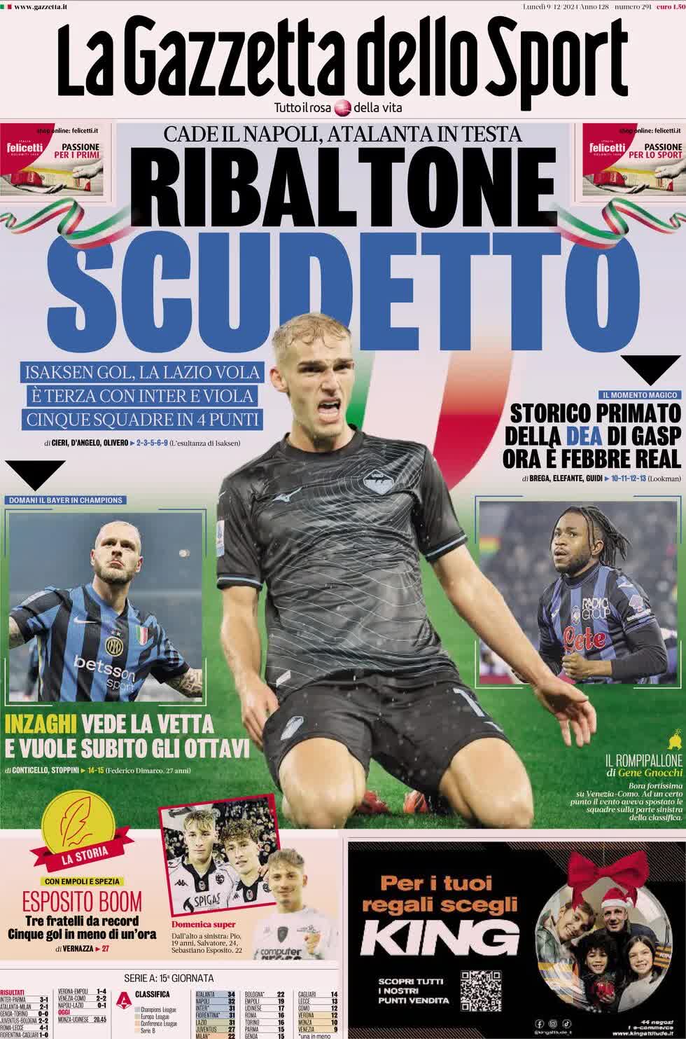 "Ribaltone Scudetto". Titola così in prima pagina La Gazzetta dello Sport, soffermandosi sulla vittoria conquistata dalla Lazio in casa del Napoli. I biancocelesti hanno raccolto una vittoria fondamentale in casa degli azzurri, puniti da una rete di Isaksen nella ripresa. La Lazio è così salita al terzo posto con 31 punti, con una sola lunghezza di di distanza dal Napoli e tre punti di distacco dalla capolista Atalanta.