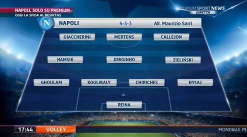 Arrivano nuovi aggiornamenti sulla probabile formazione del Napoli che sfiderà stasera il Besiktas. Secondo Premium Sport non ci sarà Gabbiadini in attacco: tridente composto da Callejon, Mertens e Giaccherini. A centrocampo titolare Zielinski che prende il posto di Allan, confermati Jorginho e Hamsik. In difesa Hysaj vince il ballottaggio con Maggio, Ghoulam sulla sinistra. Al centro resta in panchina Maksimovic, Chiriches affinacherà Koulibaly. Indicazioni che potrebbero essere confermate tra poco dalla formazione ufficiale comunicata dal Napoli