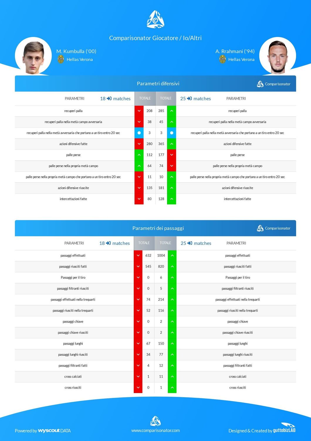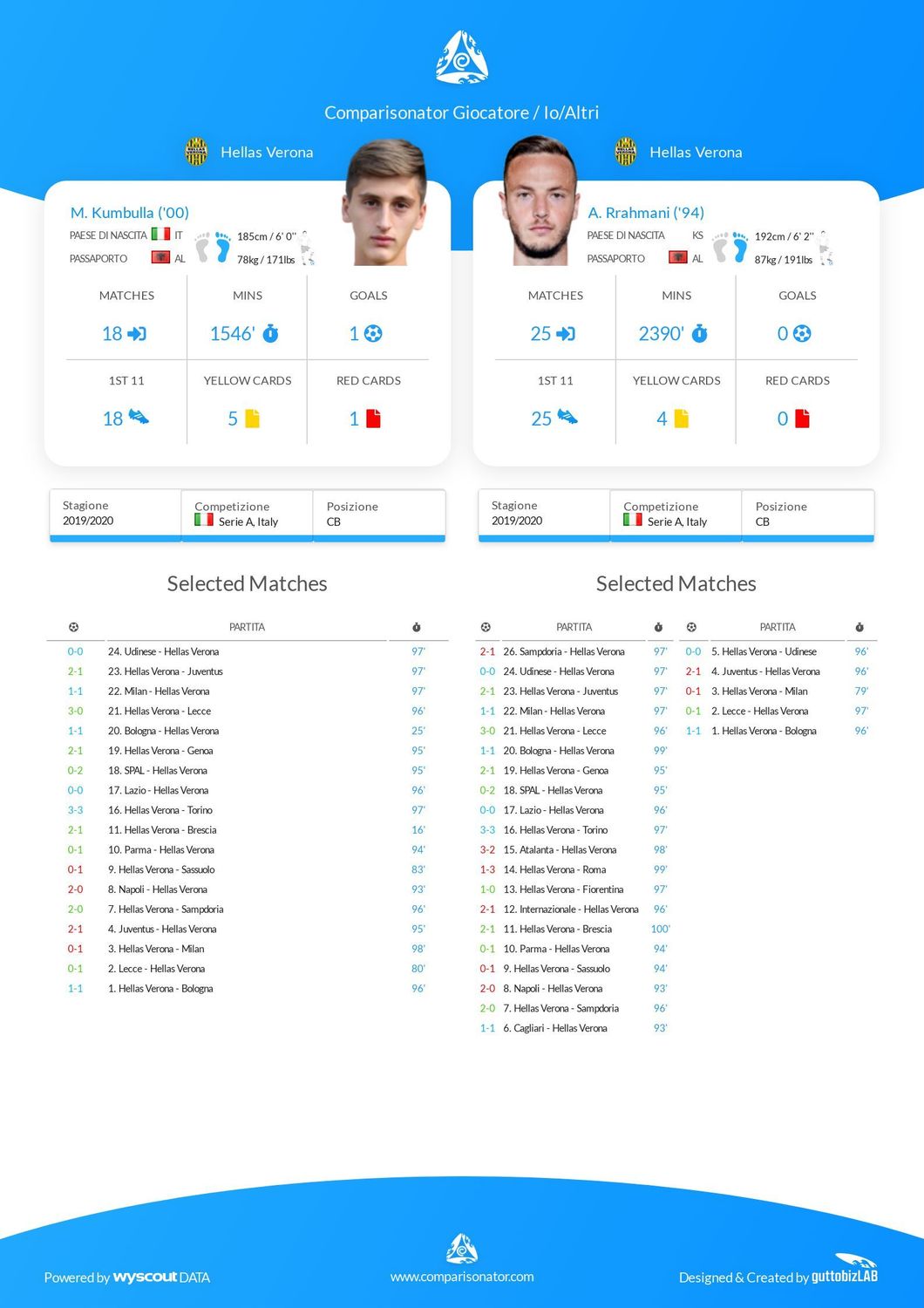 L’insostituibile di Ivan Juric è uno solo: Amir Rrahmani ha giocato tutte le partite di campionato del Verona (25), saltando appena 21 minuti, mentre Marash Kumbulla è sceso in campo 18 volte in questa Serie A. I due difensori dell’Hellas, in ogni caso, hanno già acceso i riflettori del mercato su di sé. In un caso per spegnerli rapidamente: Rrahmani ha già deciso il suo futuro al Napoli, mentre Kumbulla è conteso dalle big del nostro campionato. Diamo un'occhiata ai dati di Comparisonator per mettere a confronto i due.