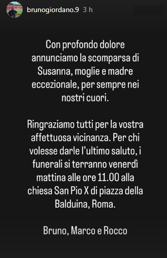 Anche la Lazio si è unita al cordoglio con un messaggio sui propri social ufficiali: “La S.S. Lazio esprime il proprio profondo cordoglio all'ex bomber biancoceleste Bruno Giordano per la scomparsa della moglie”.