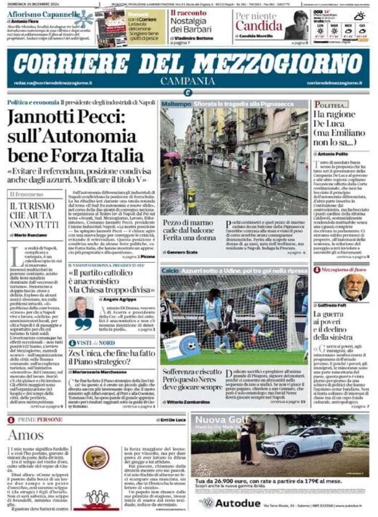 Successo esterno del Napoli. La squadra di Antonio Conte ha battuto in rimonta 3-1 l'Udinese al Bluenergy Stadium. I partenopei hanno così risposto alla vittoria dell'Atalanta nel pomeriggio di ieri e sono rimasti sempre al secondo posto. Questo il titolo in prima pagina dell'edizione campana del Corriere del Mezzogiorno: "Sofferenza e riscatto. Però questo Neres deve giocare sempre".