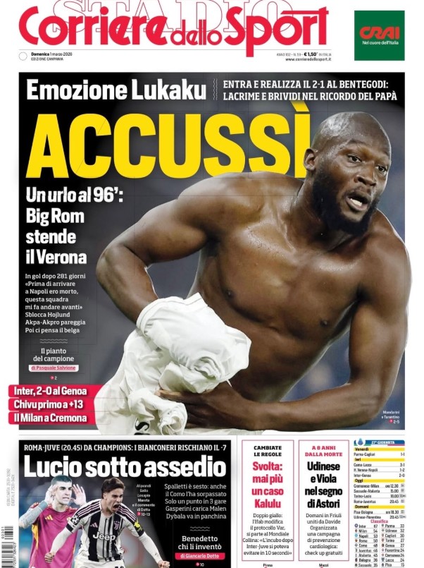 "Un urlo al 96': Big Rom stende il Verona", si legge ancora. L'attaccante belga è tornato al gol 281 giorni dopo l'ultima volta, che risaliva all'ultima giornata dello scorso campionato, con la rete del 2-0 definitivo al Cagliari che sancì il trionfo nella Serie A 2024/25.