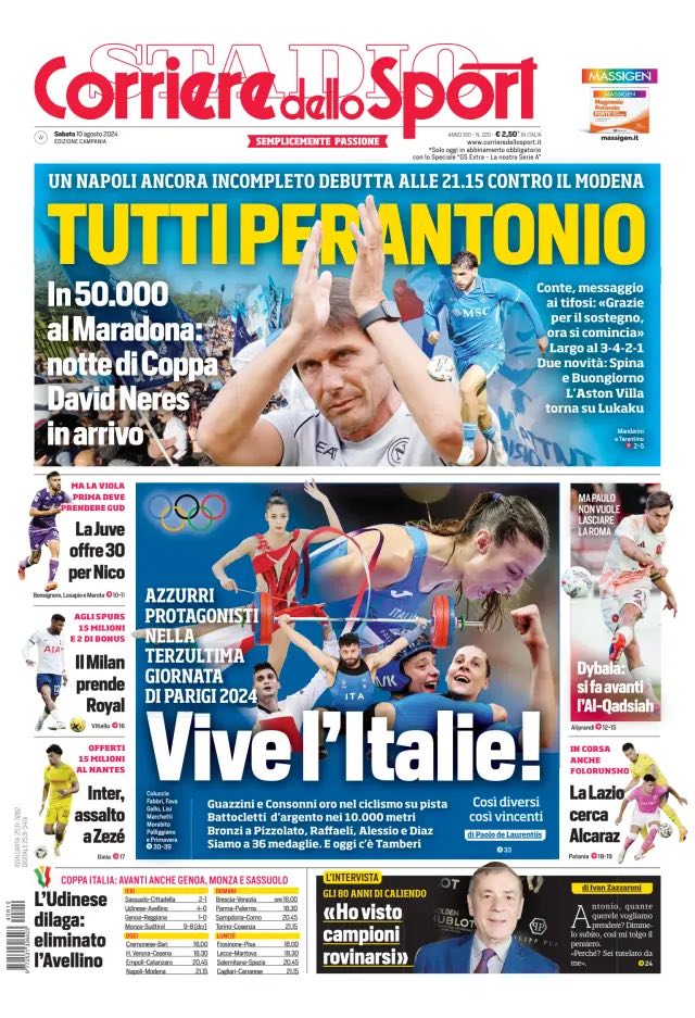 "Tutti per Antonio", titola l'edizione campana del Corriere dello Sport per raccontare dell'esordio del Napoli questa sera al Maradona in Coppa Italia contro il Modena. Previsti 50mila spettatori a Fuorigrotta mentre sul mercato "Neres in arrivo" è l'aggiornamento sulla trattativa col Benfica per il brasiliano. Di seguito la prima pagina integrale