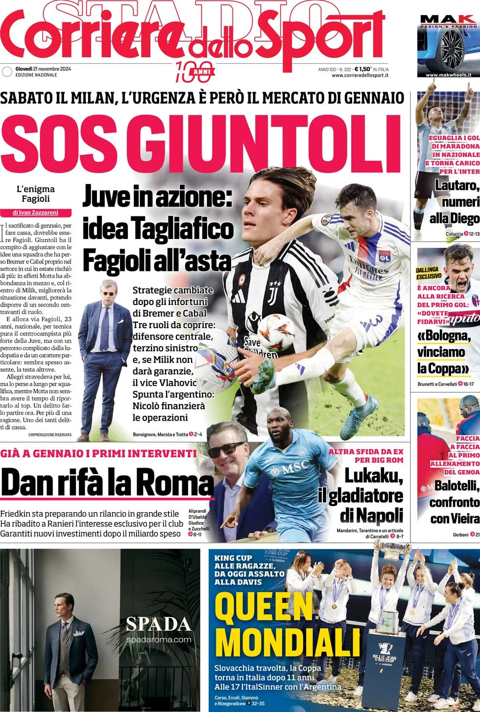 "Sos Giuntoli" scrive il Corriere dello Sport. I bianconeri si preparano ad affrontare il Milan alla ripresa del campionato ma nel frattempo pensano anche al mercato di gennaio. Strategie cambiate dopo gli infortuni ai difensori Cabal e Bremer. Idea Tagliafico, Fagioli all'asta. Sono tre i ruoli da coprire: difensore centrale, terzino sinistro e se Milik non dà garanzie anche il vice-Vlahovic.