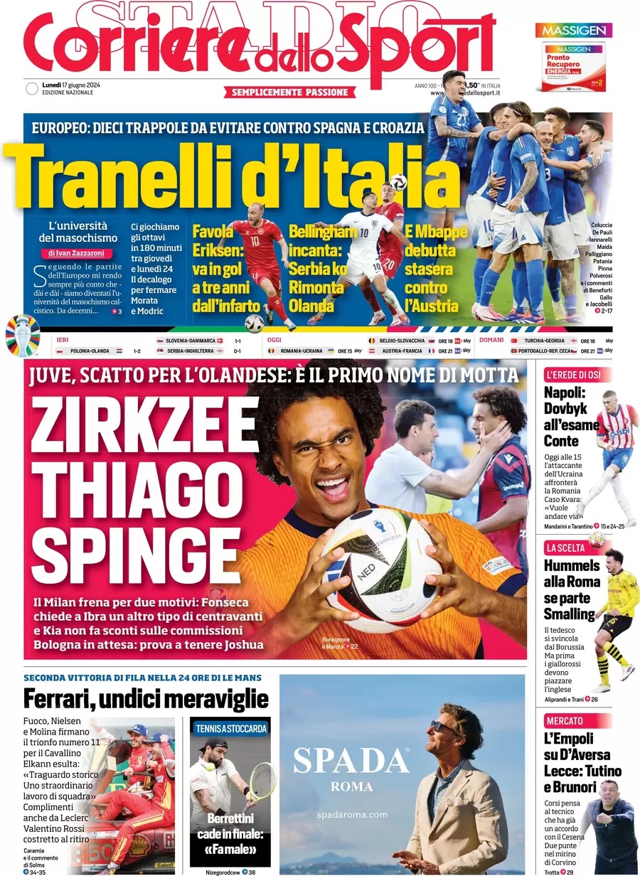 Nell'edizione di oggi, il Corriere dello Sport apre in prima pagina con il mercato della Juventus: "Zirkzee, Thiago spinge". Di spalla spazio al mercato del Napoli, con un possibile sostituto di Osimhen che scende in campo oggi: "Napoli: Dovbyk all'esame Conte. Oggi alle 15 l'attaccante dell'Ucraina affronterà la Romania". Spazio anche al caso Kvara: "Vuole andare via". In taglio alto le trappole che deve evitare l'Italia contro Spagna e Croazia: "Tranelli d'Italia". Di seguito la prima pagina integrale.