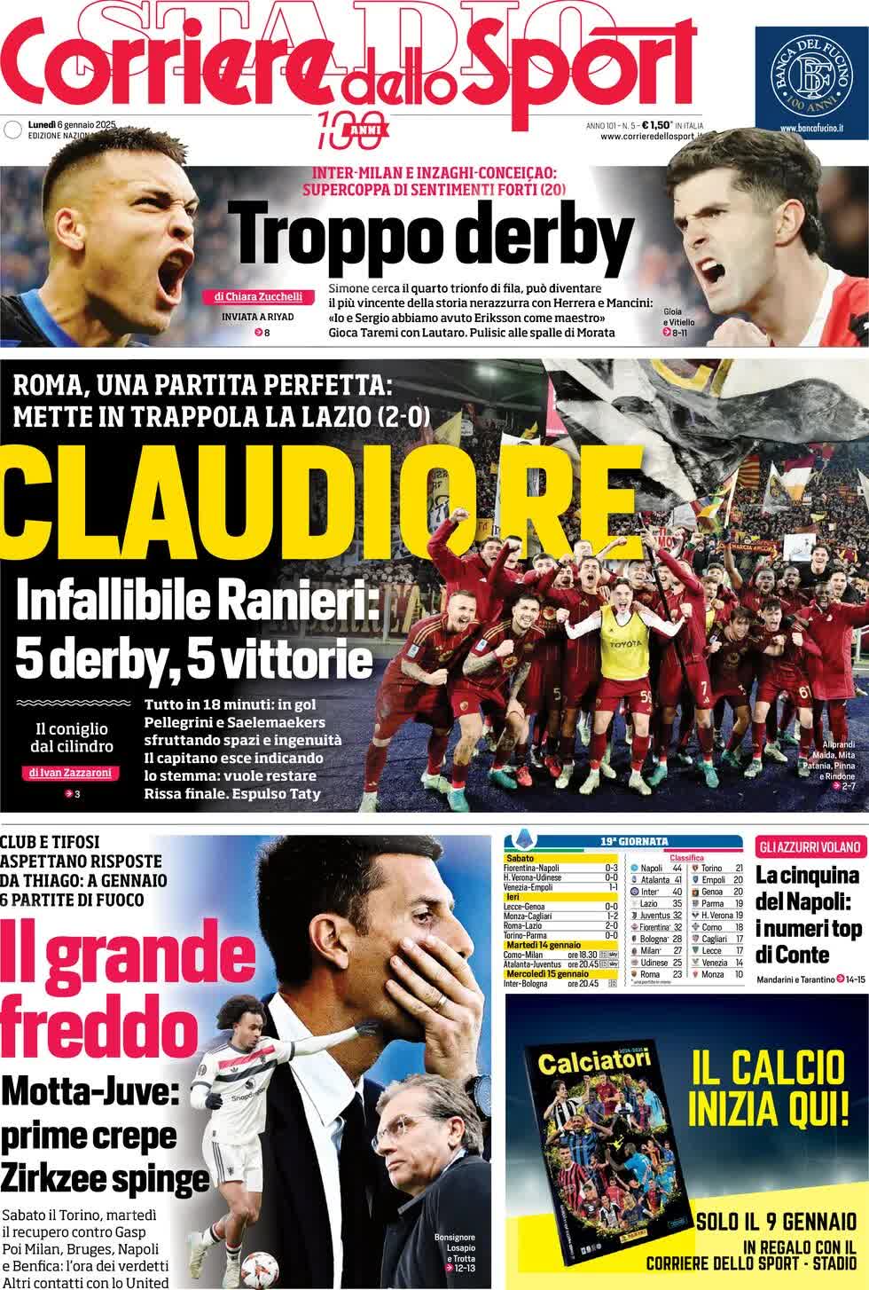 "Claudio Re". Titola così in prima pagina il Corriere dello Sport, celebrando la vittoria conquistata dalla Roma nel derby della Capitale giocato ieri all'Olimpico. I giallorossi hanno battuto la Lazio grazie alle reti di Pellegrini e Saelemaekers, andati a segno nel primo tempo. Per Claudio Ranieri si tratta della quinta vittoria in cinque derby vissuti da allenatore, un ruolino di marcia incredibile per il tecnico giallorosso.
