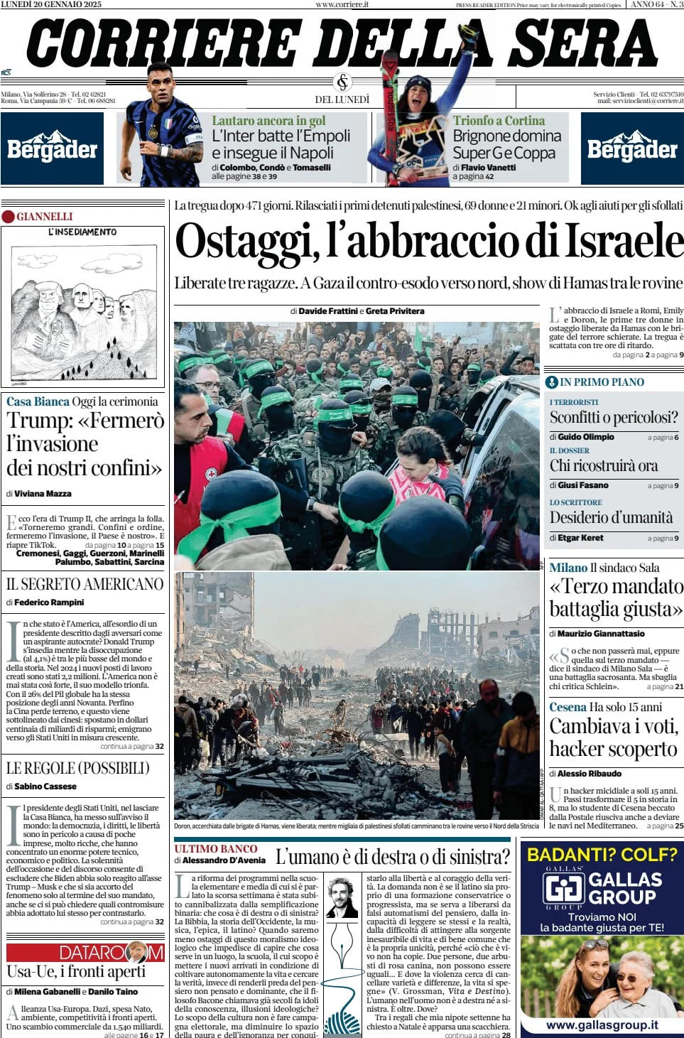 "L'Inter batte l'Empoli e insegue il Napoli" scrive il Corriere della Sera in prima pagina quest'oggi. Prosegue il duello Scudetto tra i nerazzurri di Simone Inzaghi e gli azzurri di Antonio Conte. Vittoria per 3-1 ieri sera nel posticipo per l'Inter a San Siro contro l'Empoli