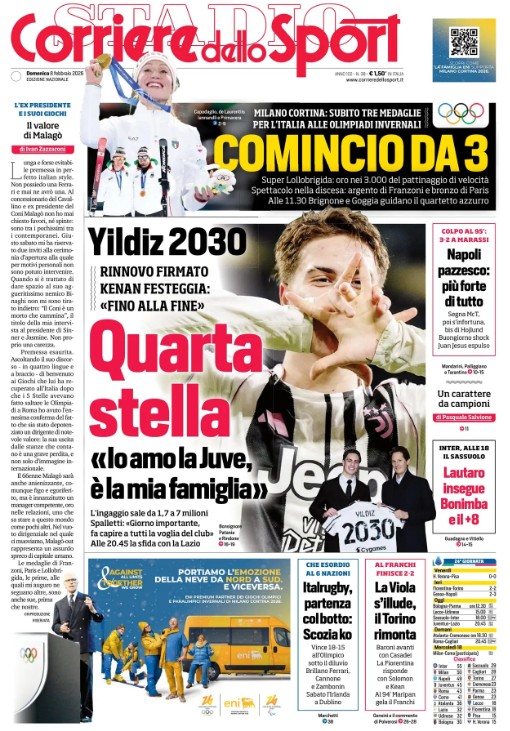 "Napoli pazzesco: più forte di tutto". E' questo il titolo che il Corriere dello Sport dedica al Napoli all'indomani della vittoria di Marassi contro il Genoa. Segna McTominay - si legge ancora - poi l'infortunio, bis di Hojlund, Buongiorno shock e Juan Jesus espulso. In primo piano il rinnovo di Yildiz con la Juventus: "Quarta stella".