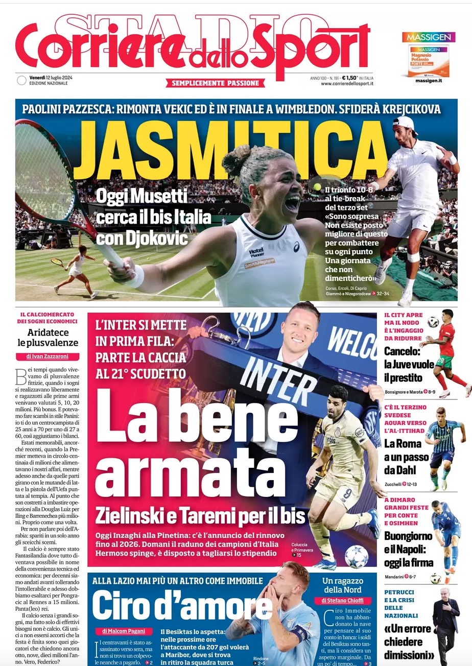 "Buongiorno-Napoli, oggi la firma", titola un box in prima pagina sul Corriere dello Sport che aggiunge "a Dimaro grandi feste per Conte ed Osimhen". L'apertura è per "La bene armata" in riferimento all'Inter in prima fila per lo Scudetto con Zielinski e Taremi ed oggi il rinnovo di Inzaghi. Di seguito la prima pagina integrale.