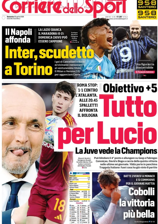 "Il Napoli affonda, la Lazio sbanca il Maradona (0-2): domenica Chivu può essere campione", si legge. Poi sulle prospettive della Juventus dopo l'1-1 della Roma contro l'Atalanta: "Tutto per Lucio: la Juve vede la Champions. Obiettivo +5. Roma Stop: 1-1 contro l'Atalanta. Alle 20.45 Spalletti affonda il Bologna".