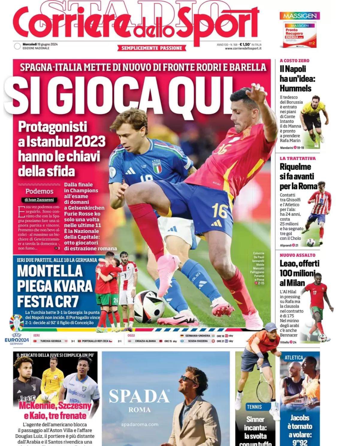 “Il Napoli ha un’idea: Hummels”. Titola così in un box a lato l’edizione odierna del Corriere dello Sport: “Il tedesco del Borussia è entrato nei piani di Conte. Intanto il ds Manna è pronto a prendere Rafa Marin”. Spazio al centro alla sfida di domani tra Spagna e Italia: “Si gioca qui. Spagna-Italia mette di nuovo di fronte Rodri e Barella”.