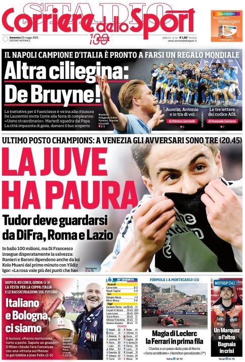 "La Juve ha paura". Questo il titolo in prima pagina dell'edizione odierna del Corriere dello Sport. La Juventus questa sera si gioca l'accesso alla prossima Champions League. La squadra di Igor Tudor è attesa da una partita non facile in casa del Venezia penultimo e con ancora possibilità di salvarsi. I bianconeri sarebbero quarti in caso di vittoria, altrimenti dovranno vedere i risultati delle romane.