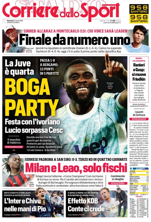 "Effetto KDB, Conte ci crede". E' questo il titolo che il Corriere dello Sport dedica al Napoli nel giorno della partita contro il Parma. Dal rientro del centrocampista belga - si legge ancora - gli azzurri hanno sempre vinto. In primo piano spazio invece al successo della Juventus sul campo dell'Atalanta: "Boga party".