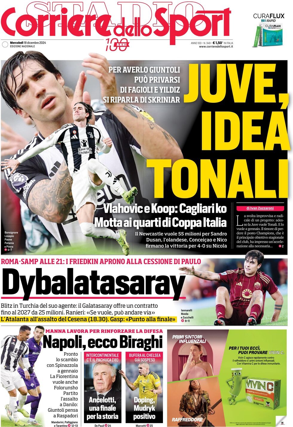 "Juve, pazza idea Tonali". Questo è il titolo principale della prima pagina di oggi del Corriere dello Sport. Per averlo Giuntoli può privarsi di Fagioli e Yildiz. Si riparla anche di Skriniar: nel frattempo, 4-0 al Cagliari in Coppa Italia.