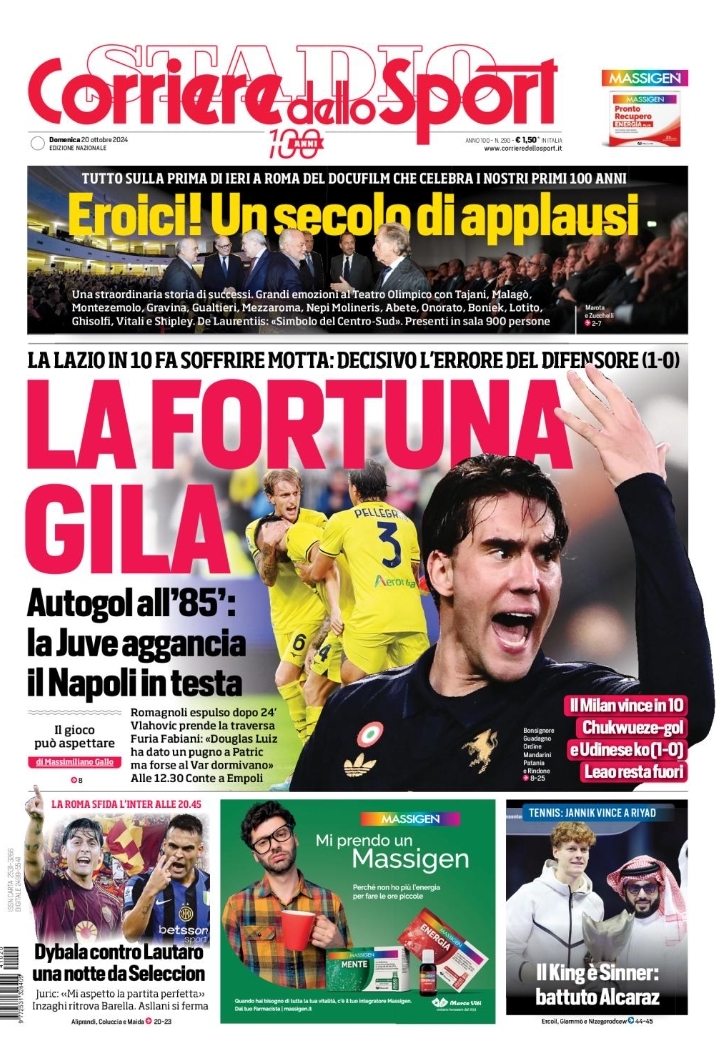 "La fortuna Gila". Così titola oggi in prima pagina il Corriere dello Sport, in merito al successo di ieri della Juventus. La Lazio n 10 fa soffrire Motta: decisivo l'autogol del difensore all'85' he consente ai bianconeri di agganciare il Napoli in vetta.