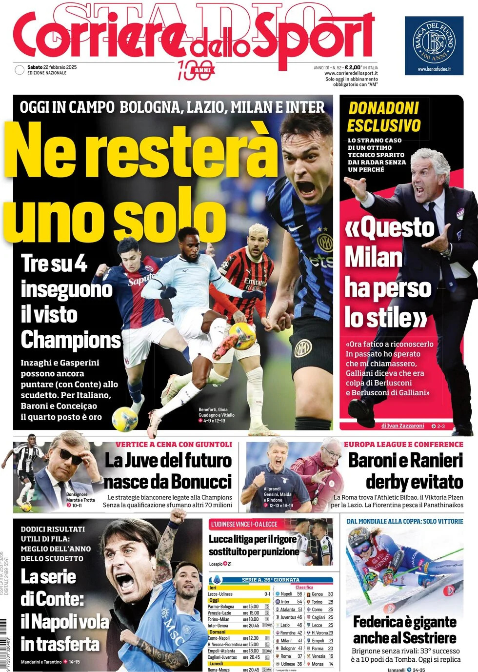 "Ne resterà uno solo" si legge nel titolo di apertura della prima pagina odierna a firma Corriere dello Sport. Oggi, infatti, scendono in campo Bologna, Lazio, Milan e Inter: di queste squadre, tre su quattro inseguono l'obiettivo Champions, ma il posto è solo uno. Con Inzaghi e Gasperini che possono ancora puntare al primo posto, per Baroni, Conceicao e Italiano il quarto posto sarebbe oro. "La serie di Conte: il Napoli vola in trasferta", il titolo del box in taglio basso sui 12 risultati utili di fila fuori casa: meglio anche dell'anno dello Scudetto.