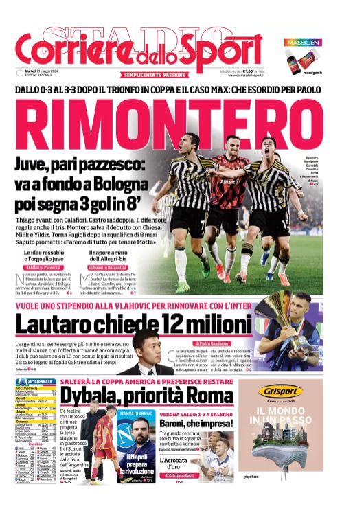 "Manna in arrivo. Il Napoli prepara la rivoluzione", scrive quest'oggi in prima pagina Il Corriere dello Sport parlando della rifondazione degli azzurri in vista della prossima stagione. Al centro titola "RiMontero", in riferimento al pareggio della Juventus alla prima di Paolo Montero sulla panchina bianconera. Il sommario: "Dallo 0-3 al 3-3 dopo il trionfo in Coppa e il caso Max: che esordio per Paolo". In taglio basso un box è riservato alla situazione rinnovo del capitano nerazzurro: "Lautaro chiede 12 milioni. Vuole uno stipendio alla Vlahovic per rinnovare con l'Inter". Di seguito la prima pagina integrale