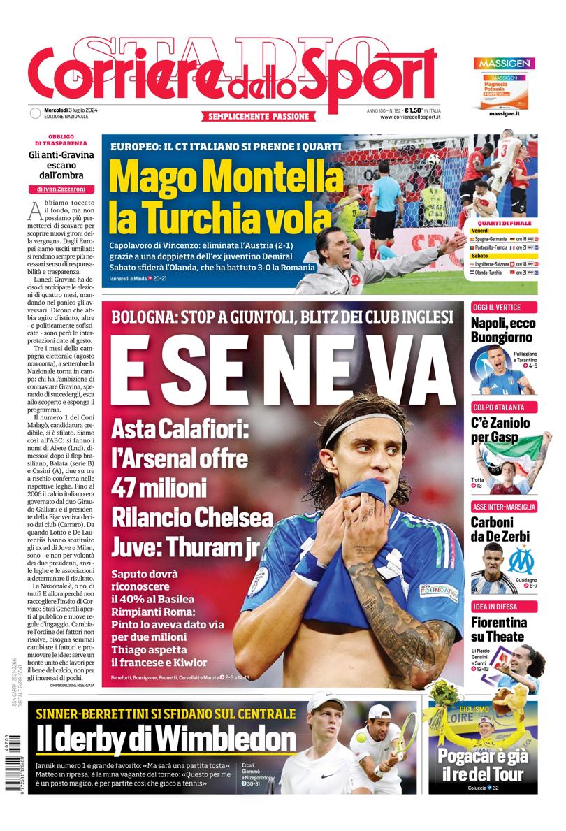 “Napoli, ecco Buongiorno”. Titola così in un box laterale l’edizione odierna del Corriere dello Sport, che di spalla parla delle operazioni di mercato di Atalanta, Fiorentina e Marsiglia. Al centro il futuro di Riccardo Calafiori, che potrebbe essere lontano dall'Italia: "E se ne va. Bologna: stop a Giuntoli, blitz dei club inglesi. Asta Calafiori: l'Arsenal offre 47 milioni. Rilancio Chelsea". In taglio alto la Turchia ai quarti di finale agli Europei.