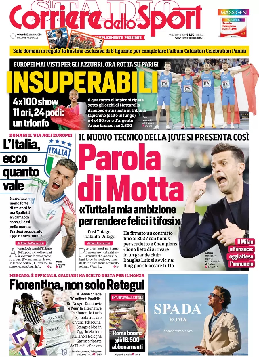 Nell'edizione di oggi, il Corriere dello Sport apre in prima pagina con le dichiarazioni di Thiago Motta, nuovo allenatore della Juventus: "Parola di Motta". Di spalla spazio alla Nazionale italiana: "L'Italia, ecco quanto vale". In taglio alto spazio alla Nazionale d'atletica, che chiude con l'oro nella 4x100 ed è prima nel medagliere degli Europei: "Insuperabili". In taglio basso il mercato della Fiorentina: "Fiorentina, non solo Retegui". Di seguito la prima pagina integrale.