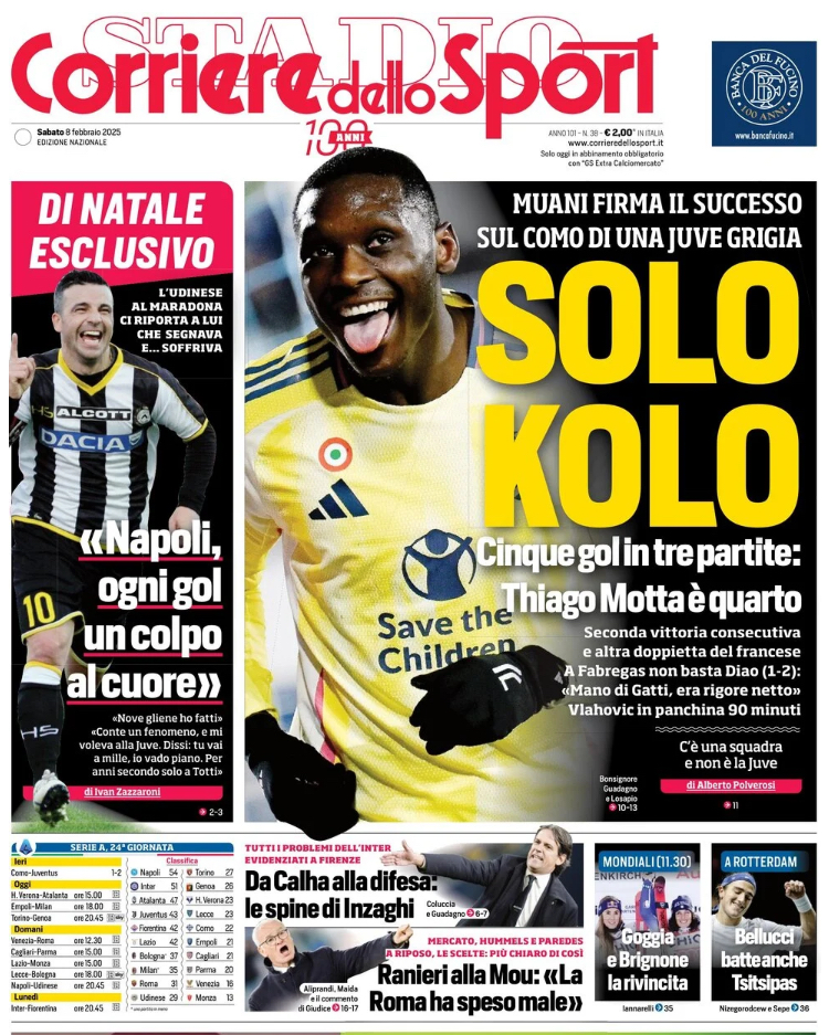 Vittoria esterna per la Juventus. La squadra di Thiago Motta supera 2-1 il Como al "Sinigaglia" grazie ad una doppietta di Randal Kolo Muani. Il francese ha dimostrato un grande impatto nella nostra Serie A risultando già decisivo. Questo il titolo in prima pagina dell'edizione odierna del Corriere dello Sport: "Solo Kolo".