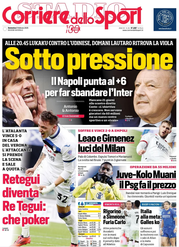 "Sotto pressione". Questo il titolo in prima pagina dell'edizione odierna del Corriere dello Sport. Questa sera il Napoli scenderà in campo al "Maradona" per affrontare l'Udinese. Gli azzurri di Conte cercano i tre punti per andare momentaneamente a +6 sull'Inter che sarà impegnata domani sera a San Siro contro la Fiorentina.