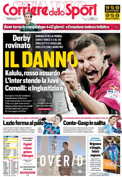 Non si placano le polemiche per il cartellino rosso sventolato a Kalulu nella prima frazione di gara di Inter-Juventus. Alla fine sono i nerazzurri a spuntarla sui bianconeri per 3-2 con una rete allo scadere di Zielinski. Questo il titolo in prima pagina dell'edizione odierna del Corriere dello Sport: "Il danno".