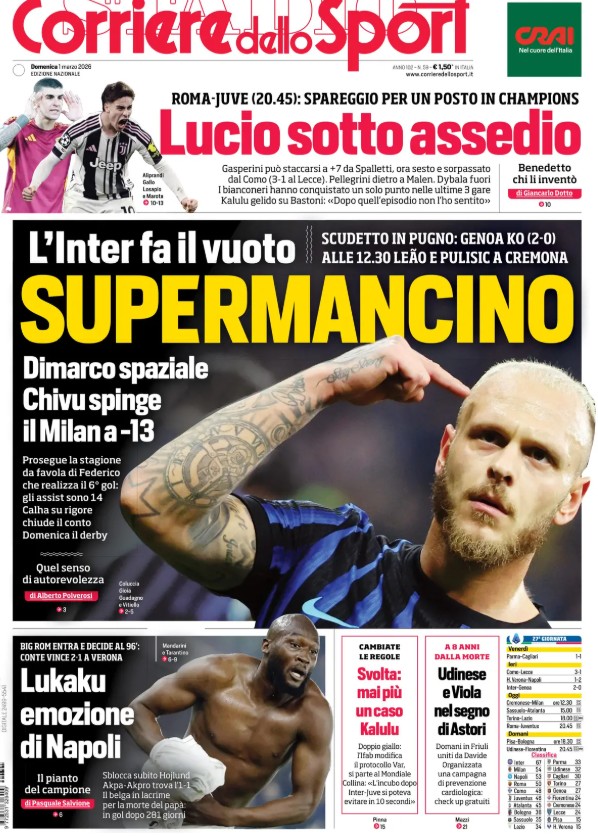 "Supermancino". E' questo il titolo che il Corriere dello Sport sceglie per la prima pagina di oggi. Il riferimento è a Dimarco, definito spaziale dal quotidiano, ricordando che si tratta del sesto gol, mentre gli assist sono 14. L'Inter fa il vuoto - si legge ancora - portandosi a +13 sul Milan.