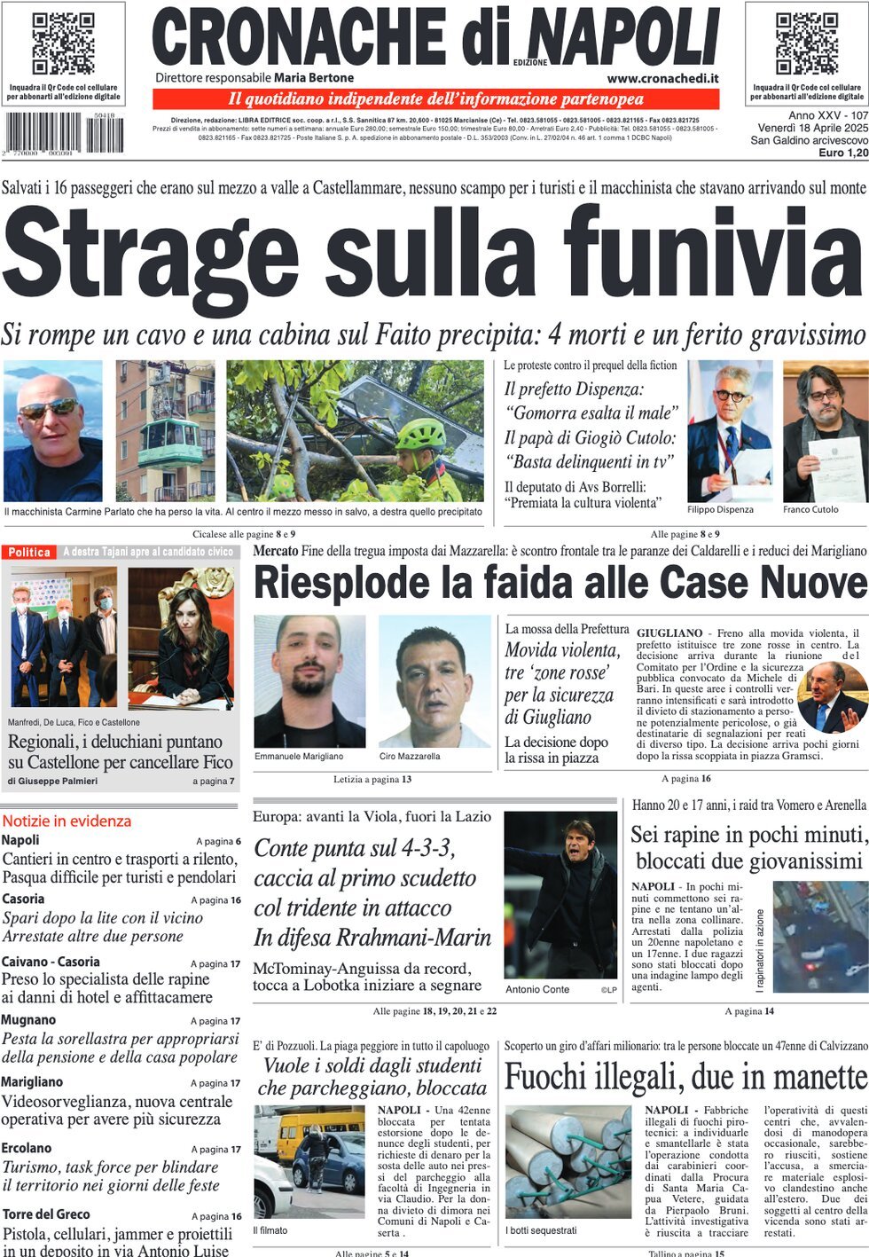 "Conte punta sul 4-3-3". Spazio anche al calcio oggi in prima pagina su Cronache di Napoli, con il titolo appena riportato che riguarda la squadra partenopea. Prosegue così: "Caccia al primo scudetto col tridente in attacco. In difesa Rrahmani-Marin". Il marchio di fabbrica di Conte, prima alla Juventus e poi all'Inter, è infatti sempre stato il 3-5-2. Modulo utilizzato anche quest'anno, ma il 4-3-3 sfrutta meglio le caratteristiche dei giocatori che ha a disposizione.