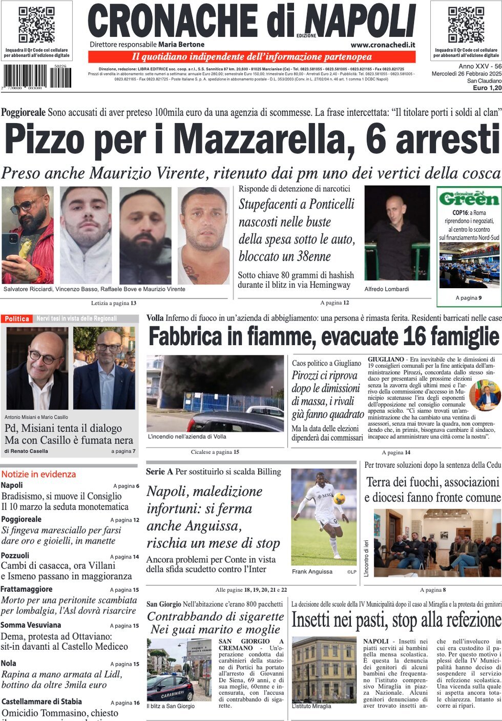 Stagione certamente non fortunata per il Napoli, soprattutto sul piano degli infortuni. Ne parla oggi in prima pagina Cronache di Napoli, con questo titolo: "Si ferma anche Anguissa, rischia un mese di stop".