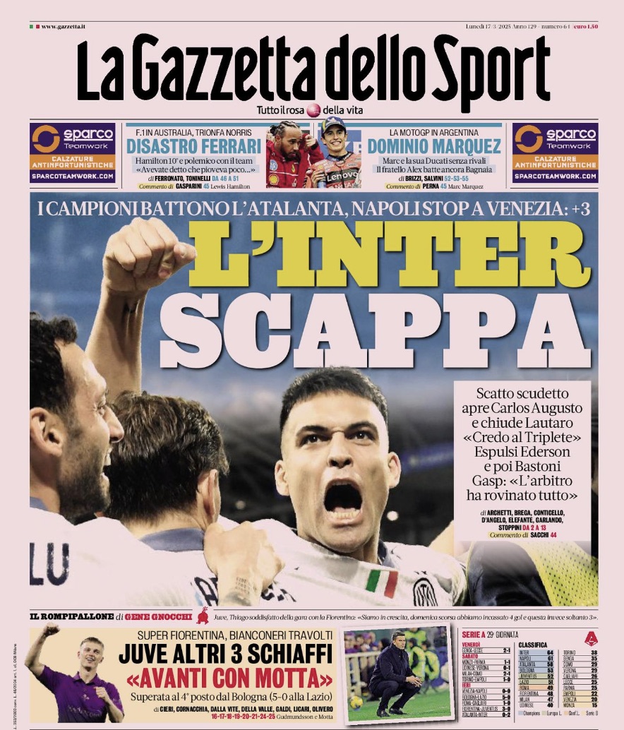 L’edizione odierna de La Gazzetta dello Sport apre con l’importantissima vittoria dell’Inter sul campo dell’Atalanta che permette alla squadra di Inzaghi di portarsi a +3 dal secondo posto e conquistarsi un piccolo gap sulle avversarie della lotta al titolo, sfruttando anche la debacle del Napoli che al Penzo contro il Venezia non è andato oltre lo 0-0. Quando conta, invece, l’Inter risponde presente, trascinata dalle reti di Carlos Augusto e Lautaro Martinez, che nella ripresa stendono i padroni di casa rimasti senza Ederson e Gasperini, entrambi espulsi sul finale di gara.