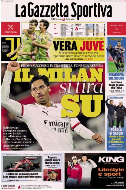 "Il Milan si tira su". Questo il titolo in prima pagina dell'edizione odierna della Gazzetta dello Sport. Successo esterno per la formazione di Paulo Fonseca che nell'anticipo del sabato sera ha espugnato l'U-Power Stadium imponendosi 1-0 contro il Monza padrone di casa. Decisivo un gol sul finire di prima frazione di gara realizzato da Reijnders.