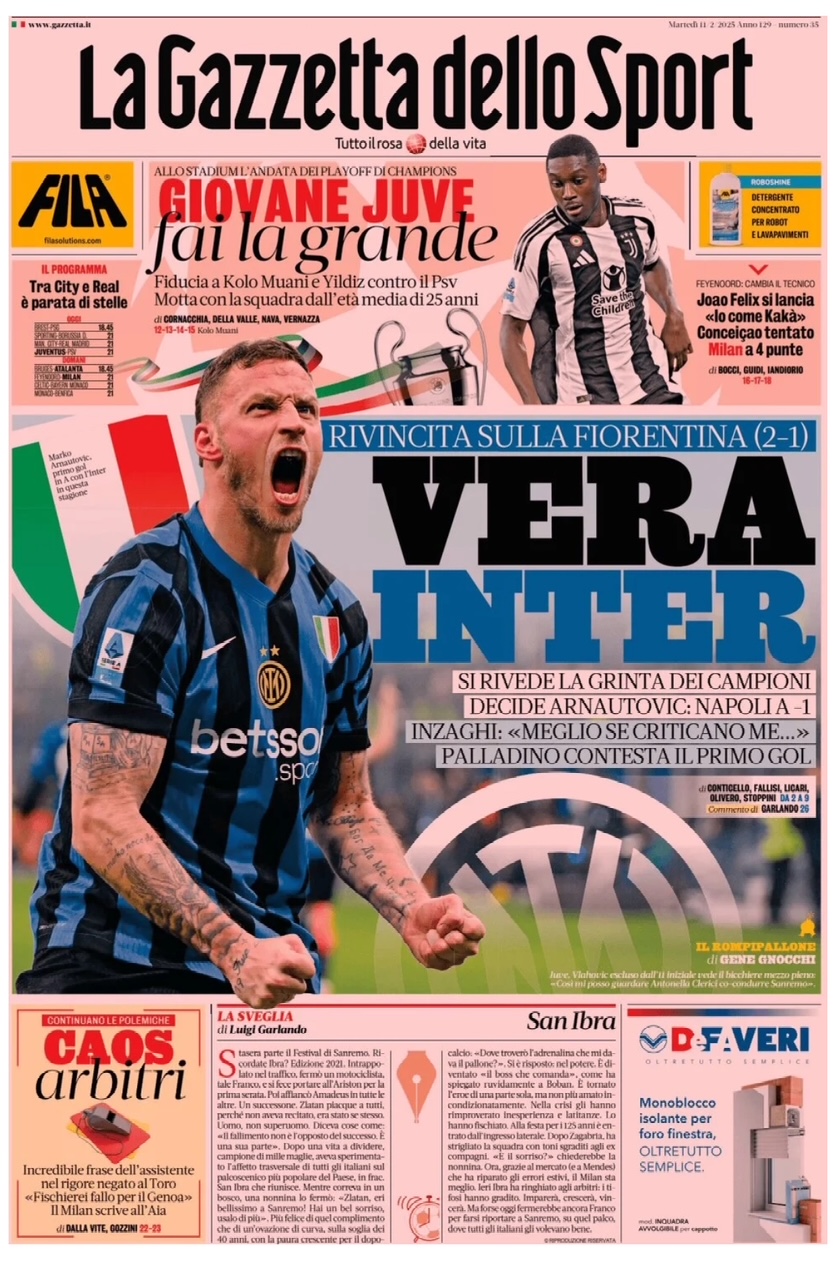 "Vera Inter" è il titolo con cui si apre l'odierna edizione de La Gazzetta dello Sport sulla vittoria dell'Inter di ieri sera per 2-1 contro la Fiorentina. I nerazzurri si prendono la rivincita dopo la gara di giovedì scorso del Franchi. Si rivede la grinta dei campioni. La decide Arnautovic con un colpo di testa. Il Napoli adesso è a -1. La Fiorentina contesta il primo gol, mentre Inzaghi a protezione della squadra dice "Meglio se criticano me...".
