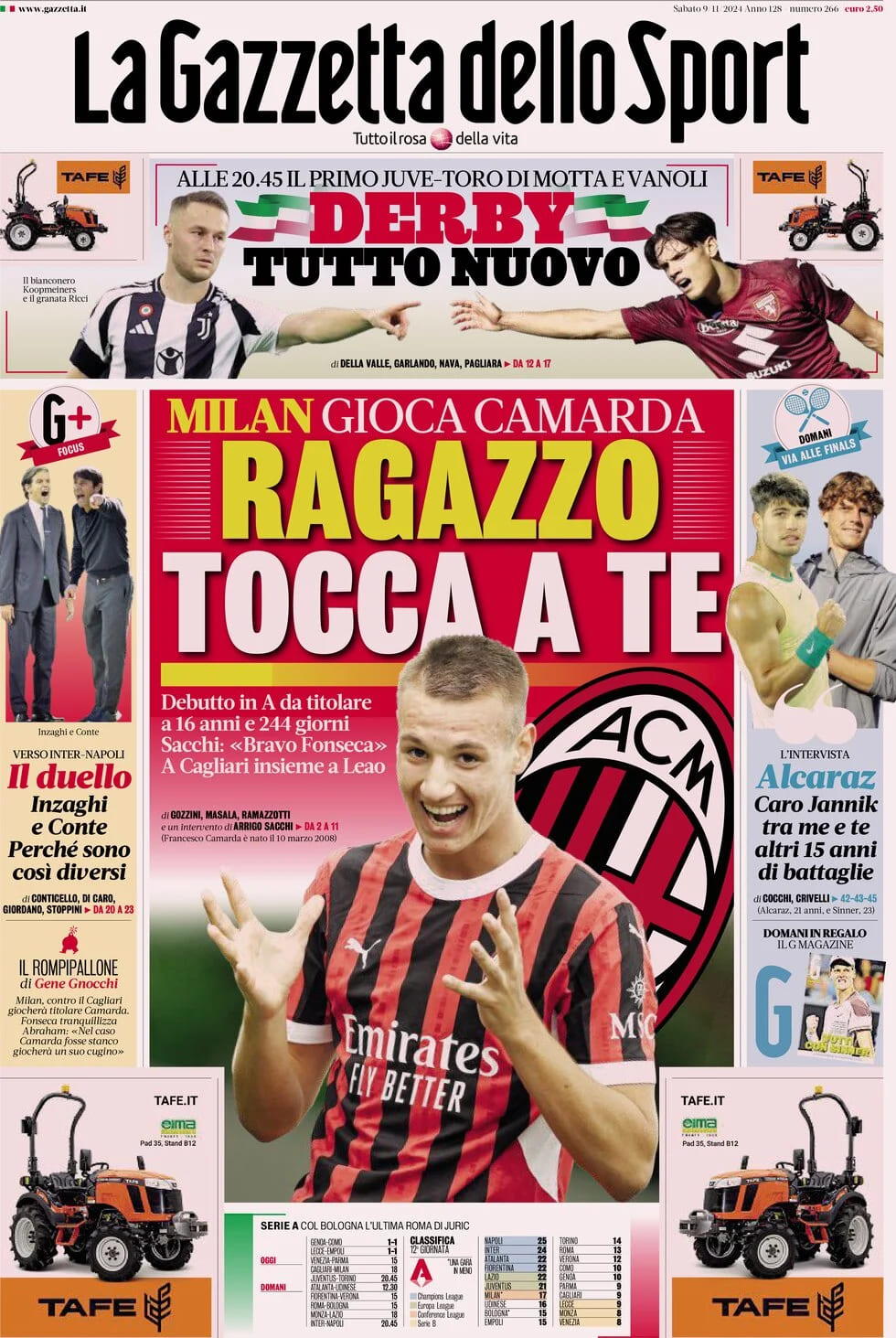 "Ragazzo tocca a te" scrive La Gazzetta dello Sport in apertura commentando la scelta di Paulo Fonseca di lanciare dal 1' minuto il classe 2008 Francesco Camarda nel match di quest'oggi a Cagliari insieme a Rafa Leao. Pronto il debutto in Serie A da titolare a 16 anni e 244 giorni. Arrigo Sacchi elogia il tecnico rossonero: "Bravo Fonseca".