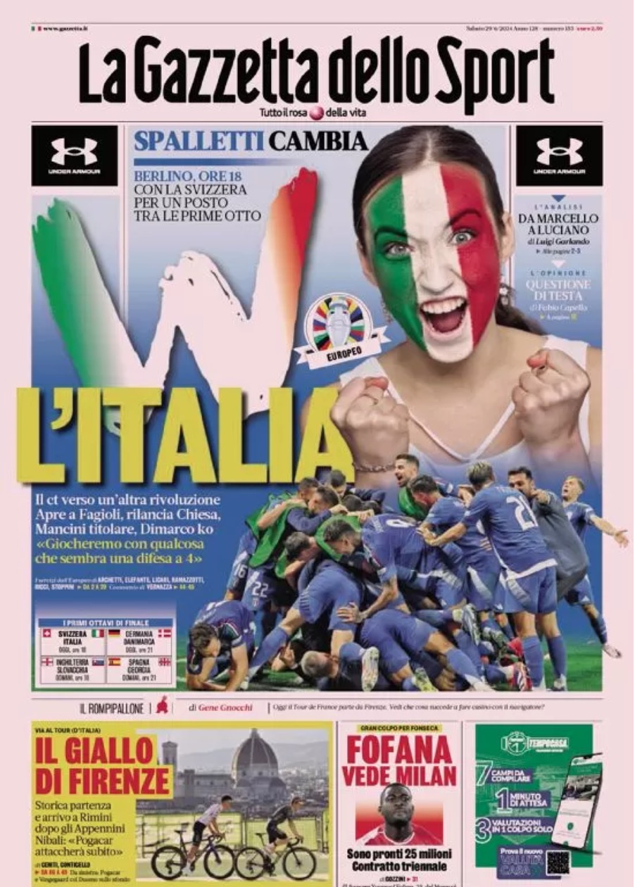 W l'Italia, titola quest'oggi la Gazzetta dello Sport nella giornata della sfida della nazionale alla Svizzera per gli ottavi di finale. Spalletti cambia per una formazione rivoluzionata: apre a Fagioli, rilancia Chiesa con Mancini titolare. Dimarco invece ko. In taglio basso invece il Milan su Fofana: sono pronti 25mln di euro. Di seguito la prima pagina integrale
