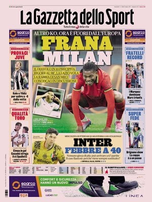 "Frana Milan. Altro ko, ora è fuori dall'Europa" recita il titolo d'apertura proposto stamattina da La Gazzetta dello Sport in prima pagina dopo l'ennesimo ko dei rossoneri, sconfitti 2-1 dalla Lazio all'ultimo respiro con il rigore realizzato da Pedro: "Il Diavolo in 10 precipita: rigore al 98', la Lazio vola - si legge -. La rabbia di San Siro, Conceicao in discussione".
