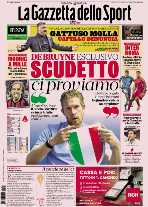 La Gazzetta dello Sport oggi in edicola propone un'intervista a Kevin De Bruyne: "Scudetto? Ci proviamo", il titolo scelto dal quotidiano. Poi ancora il centrocampista belga: "A Napoli sto bene. Il nostro obiettivo è vincerle tutte e poi faremo i conti. Abbiamo pagato troppi infortuni. Hojlund diventerà un top player".