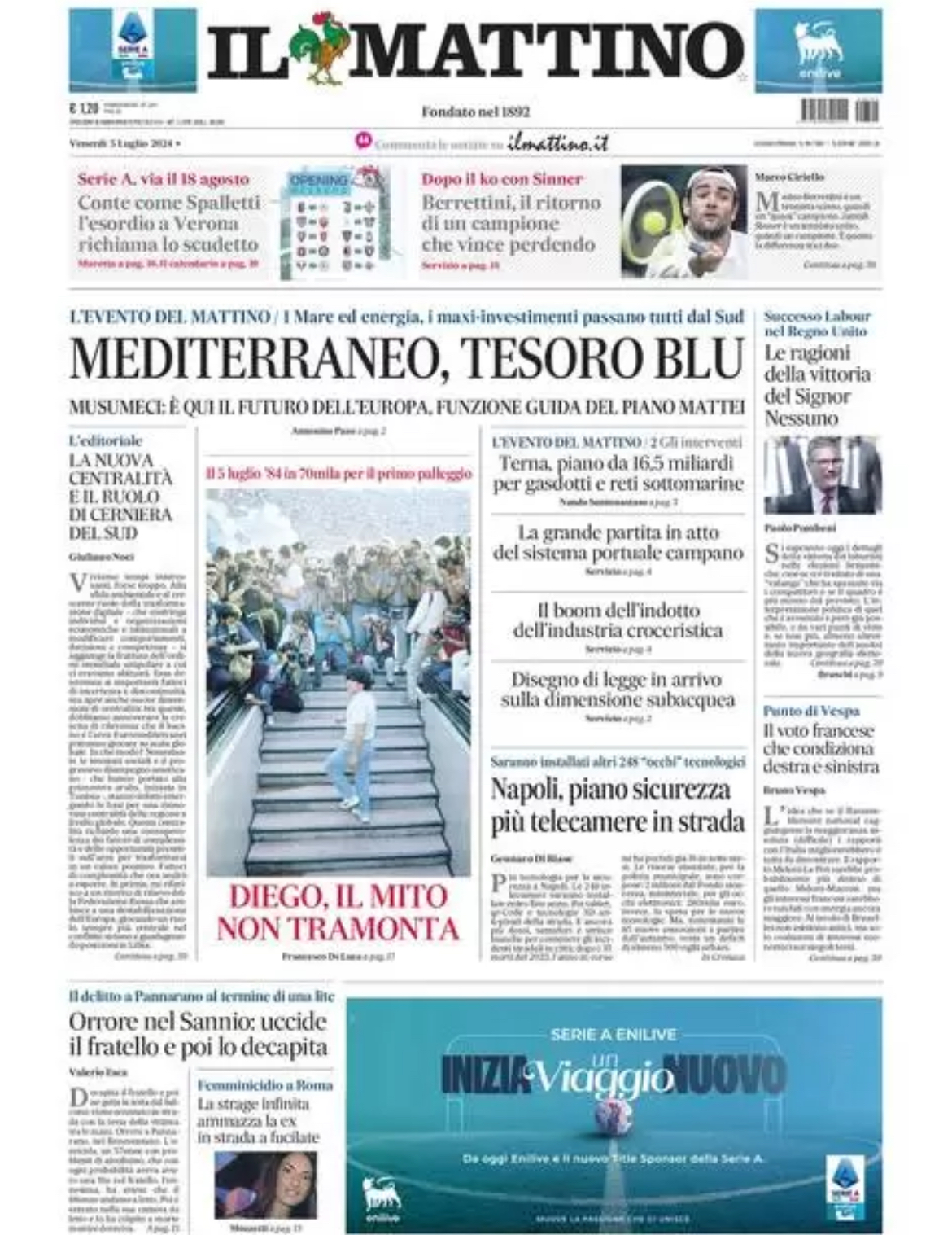 Nell'edizione di oggi, Il Mattino dedica spazio in prima pagina ai sorteggi del calendario della Serie A 2024/2025: “Serie A al via il 18 agosto. Conte come Spalletti, l’esordio a Verona richiama lo scudetto”. Di seguito la prima pagina integrale.