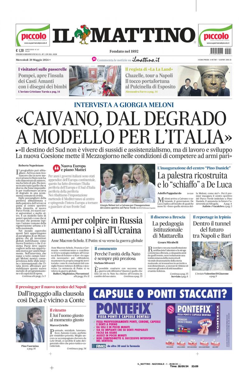 Nell'edizione di oggi, Il Mattino dedica spazio in prima pagina ad Antonio Conte, sempre più vicino alla panchina del Napoli: "Dall'ingaggio alla clausola così DeLa è vicino a Conte. Il pressing per il nuovo tecnico del Napoli". In basso il fondo proprio sul tecnico salentino: "E' lui l'uomo giusto al momento giusto". Di seguito la prima pagina integrale.