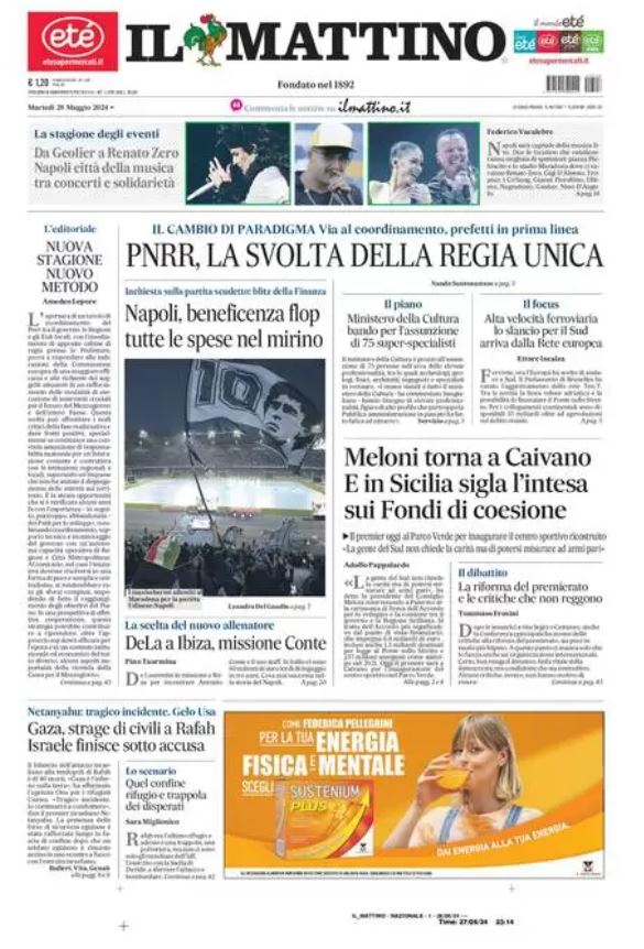 "La scelta del nuovo allenatore. DeLa a Ibiza, missione Conte", scrive così Il Mattino nell'edizione odierna, parlando del viaggio del patron azzurro per trattare col tecnico leccese l'approdo ai piedi del Vesuvio. Un box è riservato a un'inchiesta della Finanza sulla società partenopea: "Napoli, beneficenza flop: tutte le spese nel mirino". Il commento in alto: "Inchiesta sulla partita scudetto: blitz della Finanza". Di seguito la prima pagina integrale